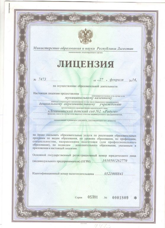 | Полное наименование образовательной организации* | Муниципальное казенное дошкольное образовательное учреждение "Левашинский детский сад №2 "Радуга" |